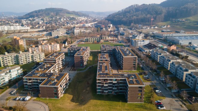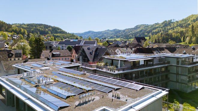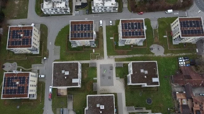 Die mit dem regionalen Architekturpreis prämierte Neubausiedlung mit 235 Wohnungen setzt auf selbst produzierten Solarstrom. Enpuls managt die komplette ZEV-Abrechnung und entwickelt zusammen mit dem Kunden weitere Lösungen zur Optimierung des Eigenverbrauchs.
